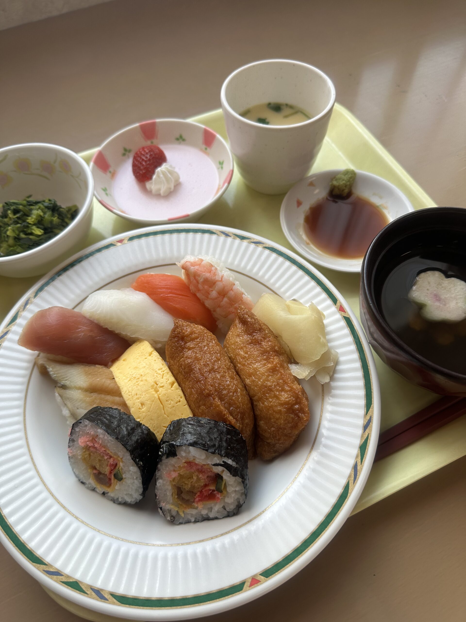 お寿司も嬉しかったのですが、私的には、いちごババロアの上に生のいちごが乗っていた事に感動しました(*´▽`*)(いちご大好きなので。。。)
