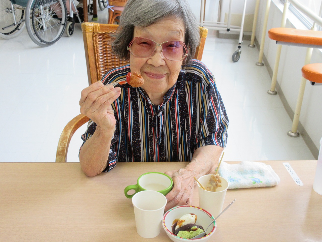 また クリスタルでは焼き鳥(ホットプレートで)パノラマは魚釣り大会等各フロアで趣向を凝らして行いました。昼食はターメリックライスとフライの盛り合わせ等で、間食は揚げ芋、ミニアメリカンドック、冷やし甘酒で、お祭り気分を味わって頂けたと思います。